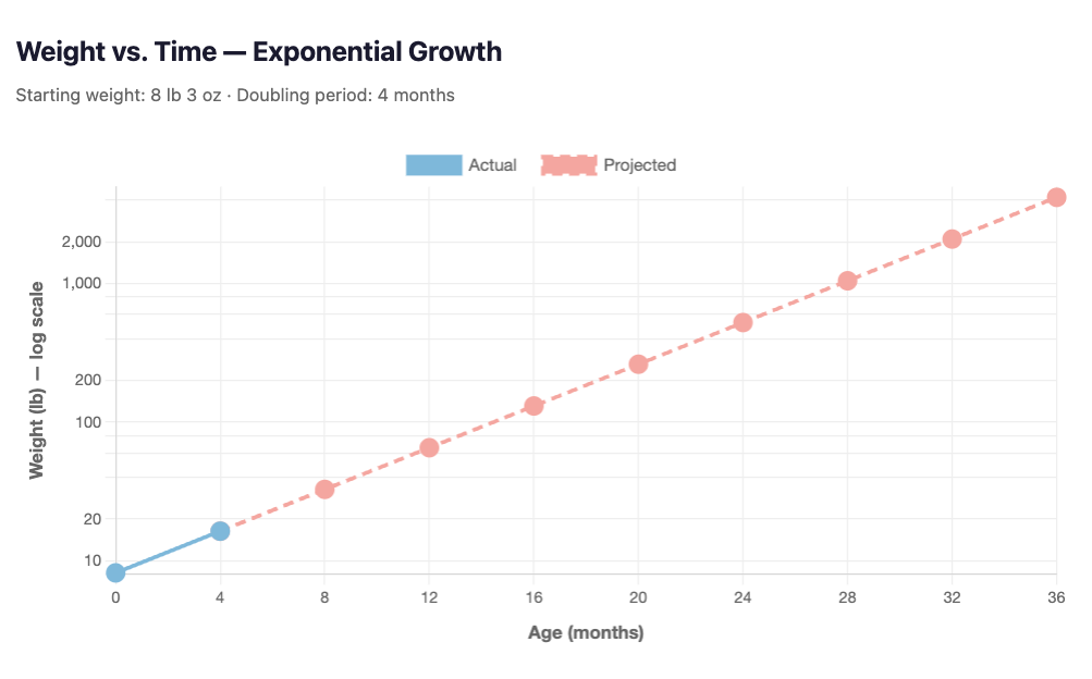 Based on prenatal in utero measurements, Nelson was estimated to be a nearly 10 pound baby at birth and, as mentioned, he came into the world as a fairly average 8 lb. 3 oz. I’m happy to report, however, that during his 4 month checkup he weighed in at 16 lb. 6 oz. This is a remarkable trend, doubling his weight in just four months! If this rate of doubling continues, Nelson will be a 4,000 lb. by his third birthday. See plot: